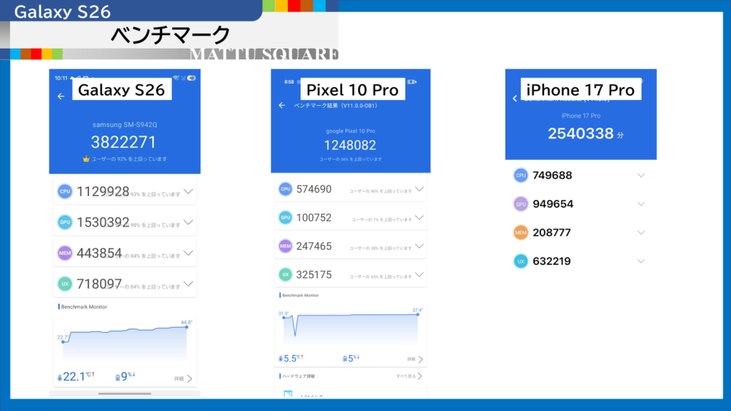 Galaxy S26と、iPhone 17 Pro・Pixel 10 ProのAnTuTu V11ベンチマークを比較すると、下記の通りです。