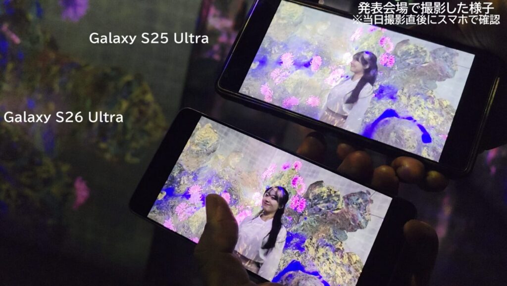 上記の映像は、Galaxy S26 UltraとGalaxy S25 Ultraを暗い環境で撮影し、撮影後にチェックしている様子です。