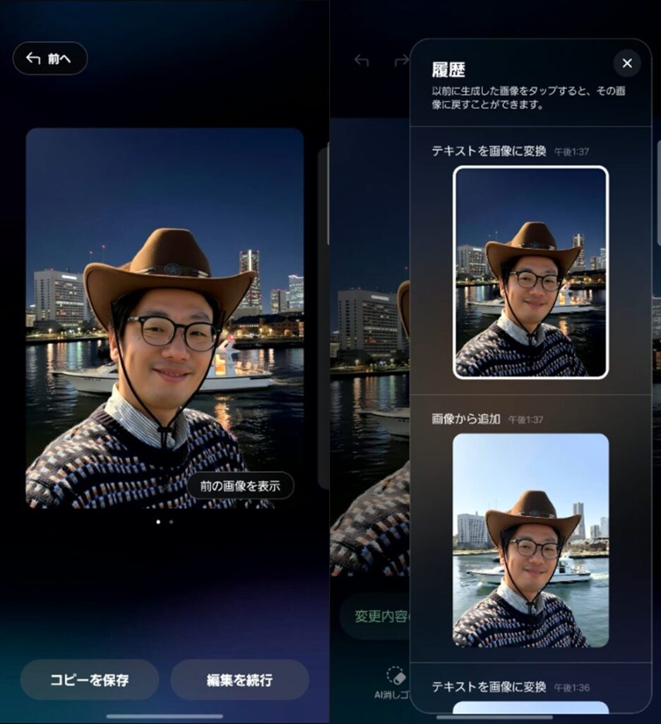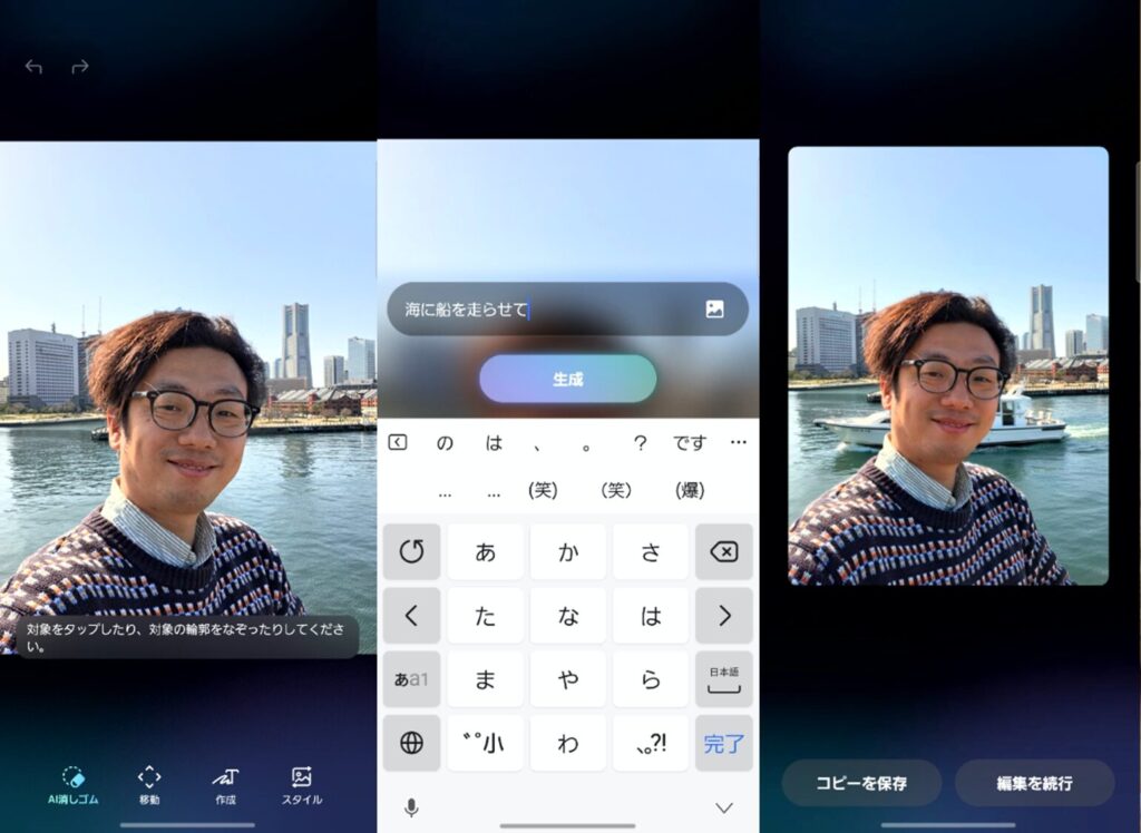 画像編集・生成できるギャラリーアプリの「フォトアシスト」では、文章で変えたい内容を指示できるようになりました。