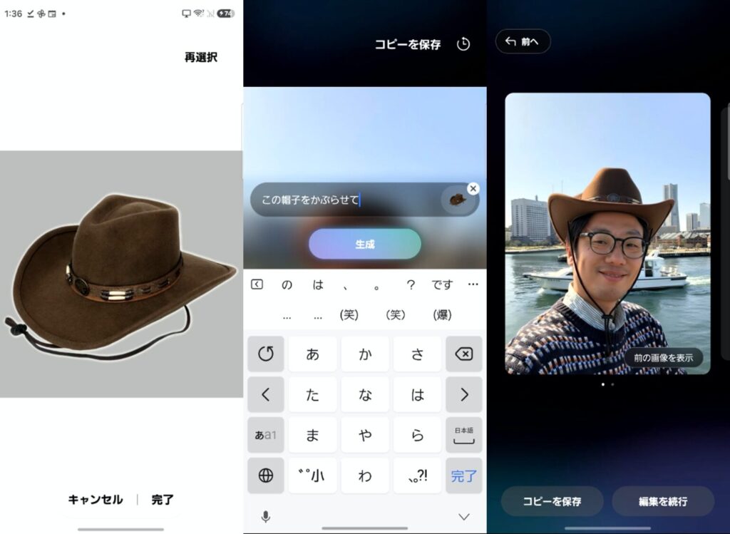 また、「海に船を走らせる」、帽子の画像を添付して「この帽子をかぶせて」、「昼から夜にして」といっても、自然な仕上がりになることが多いです。