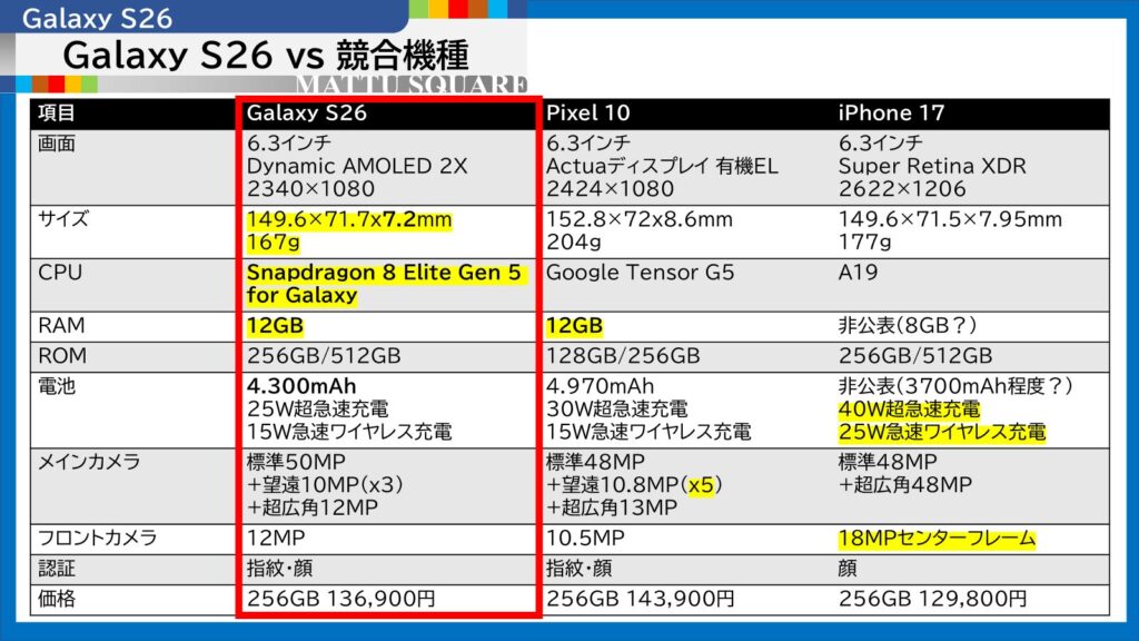 Galaxy S26は、価格的にも上位なPixel 10 ProやiPhone 17 Proにも張り合えているのもなかなかにすごいです。