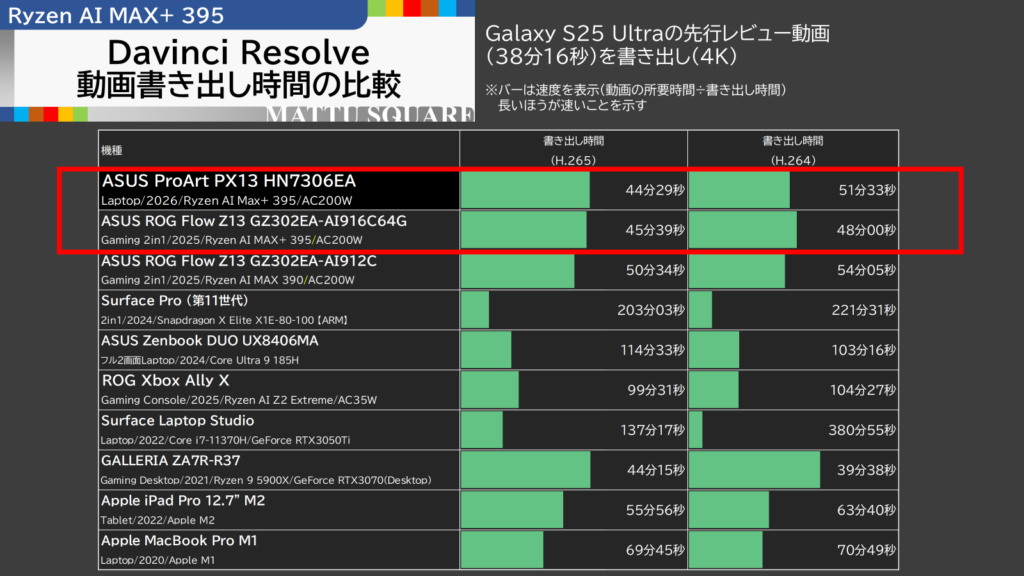38分15秒の4K動画(H.265コーデック)の書き出し時間は、ROG Flow Z13のターボモードと同等(少し上回る速度)を記録しました。