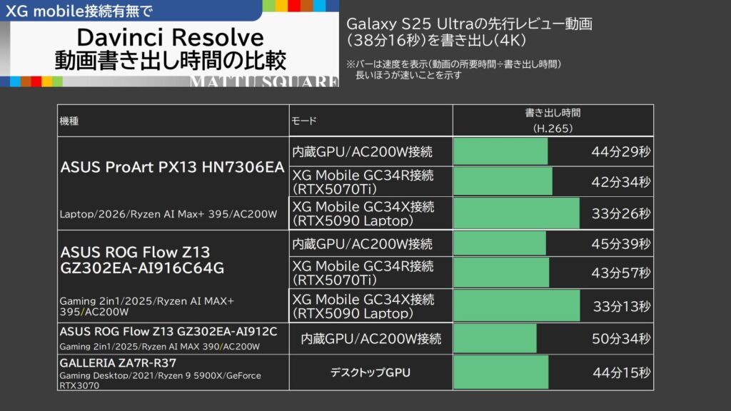 • XG Mobile (RTX 5090 Laptop): 約33分 (内蔵GPU比で約1.34倍高速化)