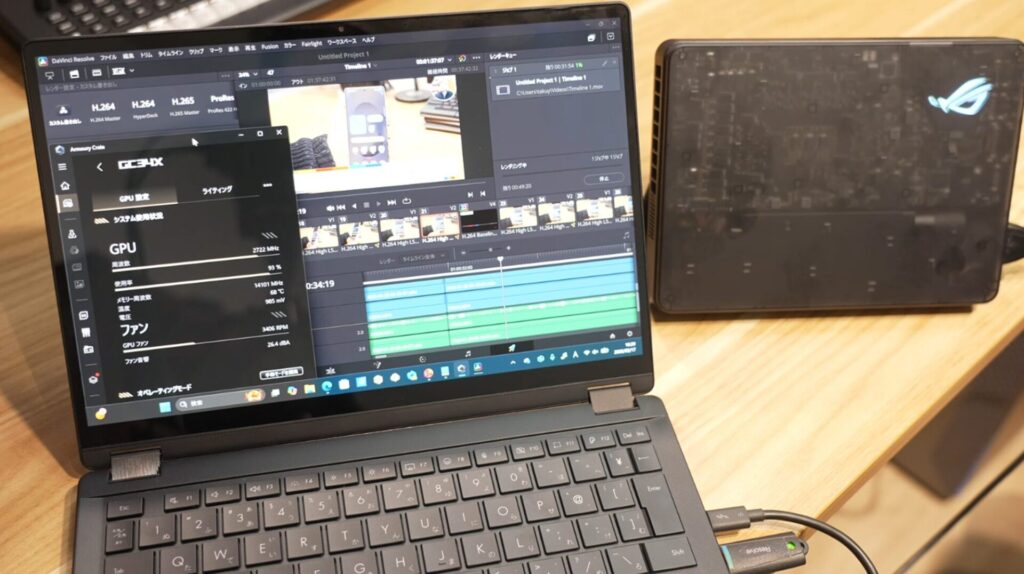 RTX 5090 Laptopモデルを接続することで、動画書き出し時間が大幅に短縮され、プロの現場での効率アップに貢献します。
