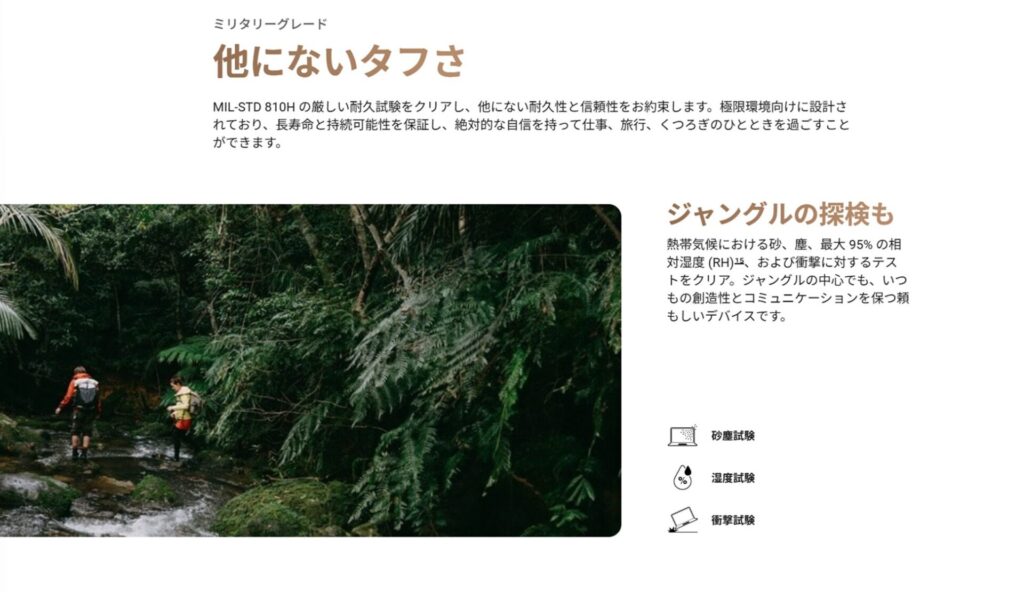 米国国防総省のMIL規格(MIL-STD 810H)に準拠しており、防塵、耐湿度、耐衝撃性能をクリア。