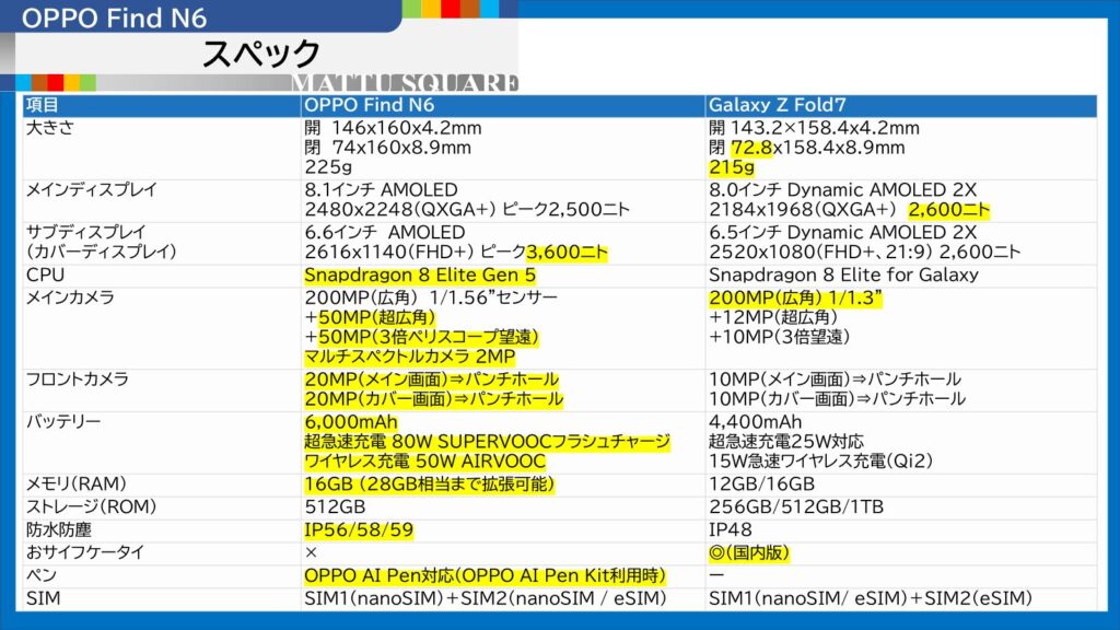 まずは、OPPO Find N6とGalaxy Z Fold7のハードの違いを簡単に確認しましょう。