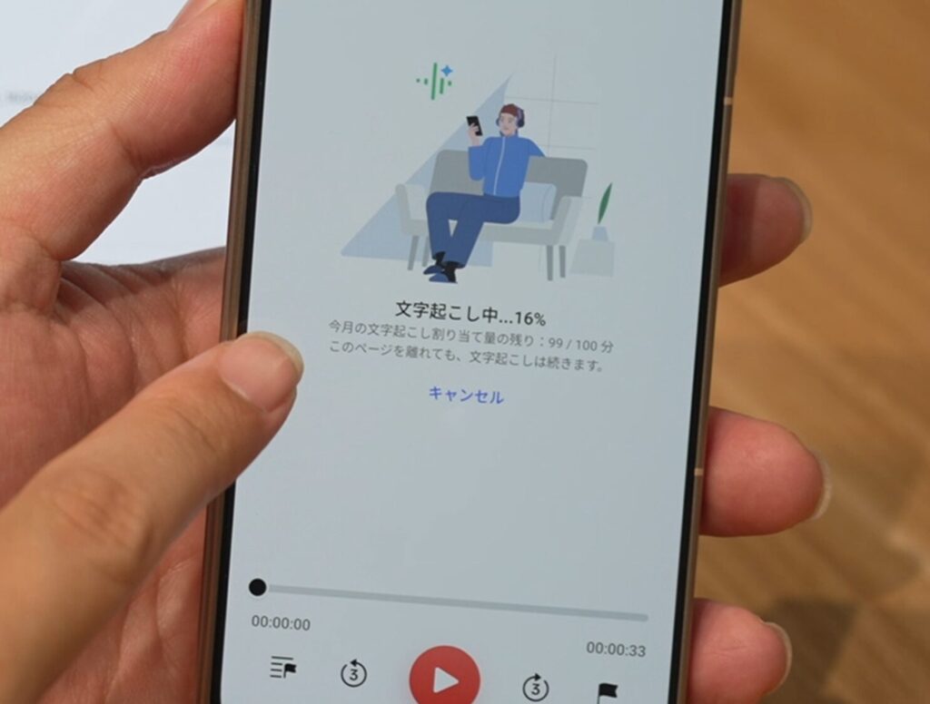 録音中にテキストでの文字起こしもできて、イヤホンやスピーカーホンでの通話の場合には文字起こしを確認することもできます。