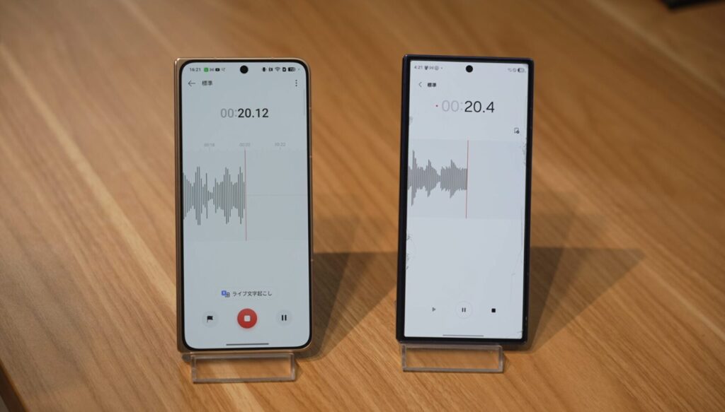 OPPO Find N6(左)には「ライブ文字起こし」のボタンがあるが、Galaxy Z Fold7(右)には文字起こし出来そうなボタンはない
