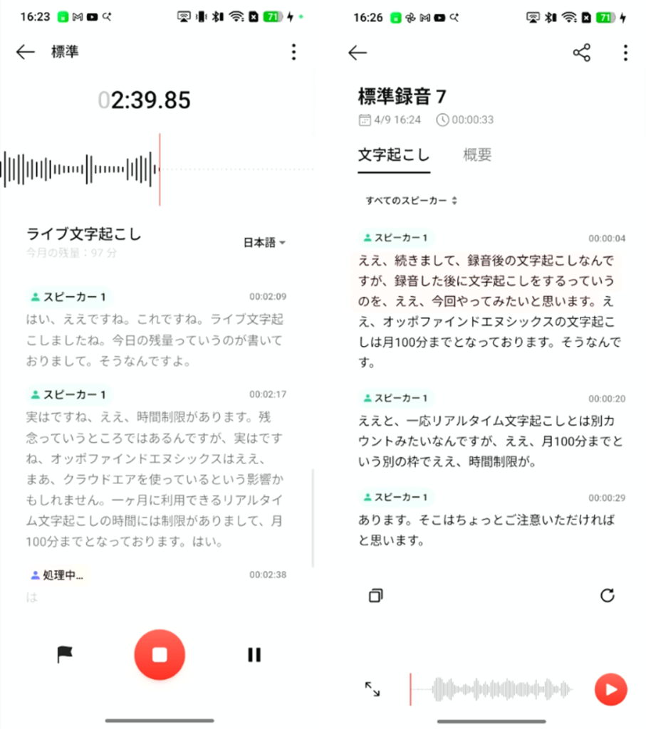 録音後の文字起こしについては、OPPO・Galaxyともに可能です。