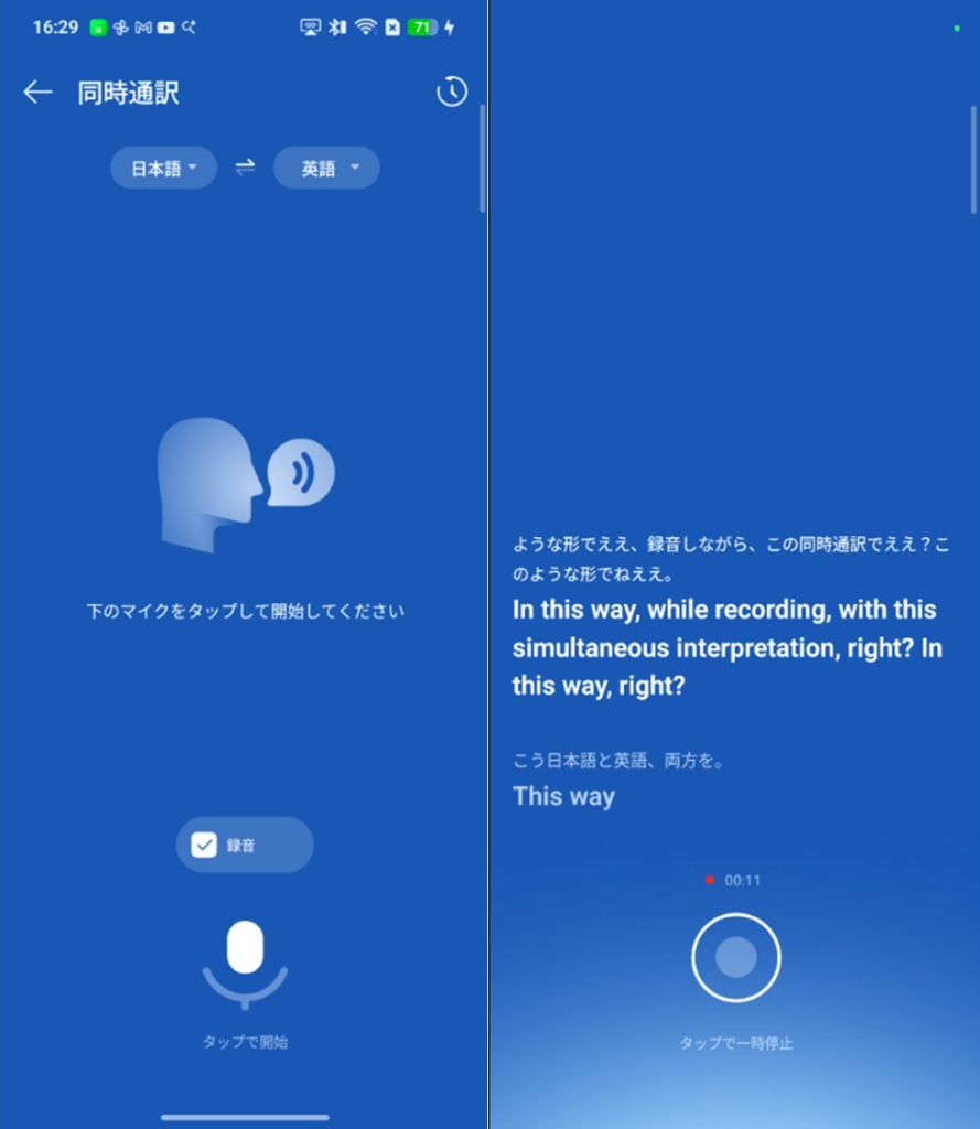 OPPO Find N6の同時通訳。Galaxyと同様、録音しながらの翻訳が可能