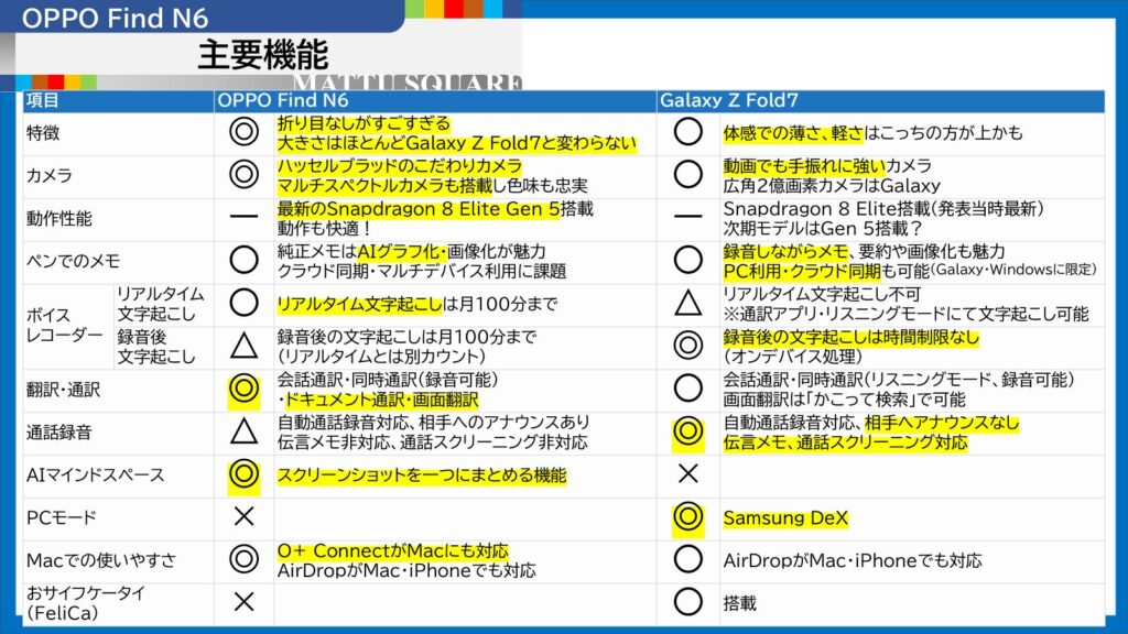 OPPO Find N6とGalaxy Z Fold7の主要機能比較まとめ