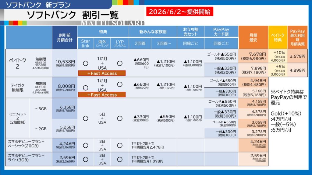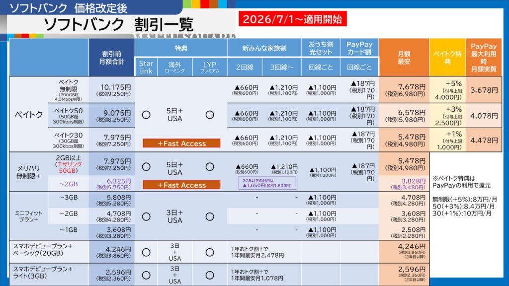 新プランの価格・割引一覧。全プラン家族割・PayPayカード割対象に!